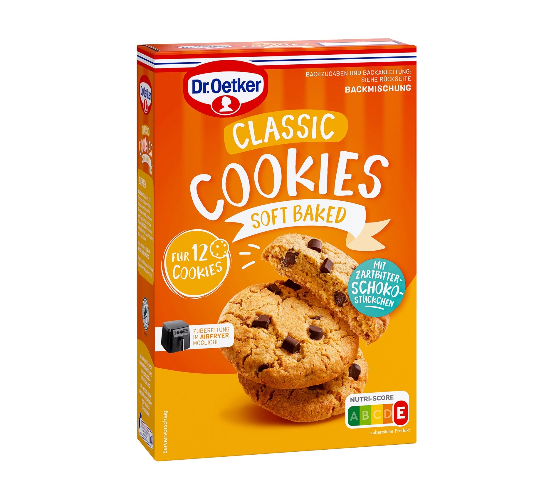 Die Dr. Oetker Classic Cookies bringen den verführerischen Geschmack frisch gebackener Cookies direkt in die Küche. Mit der Backmischung gelingen schnell und einfach 12 softe, saftige Cookies, die mit 75 g Zartbitter-Schokostückchen einen intensiven Schokoladen-Geschmack bieten.
