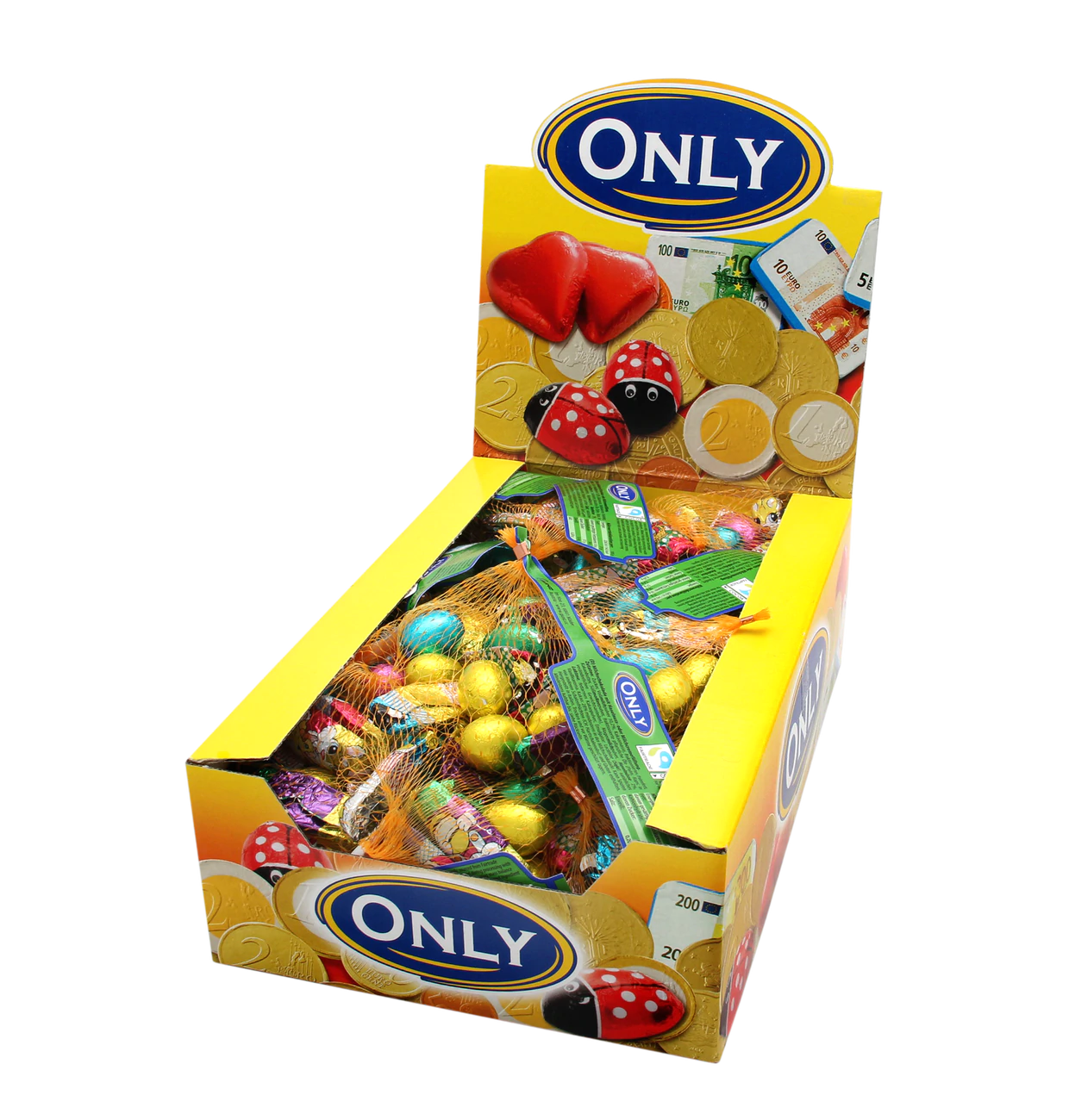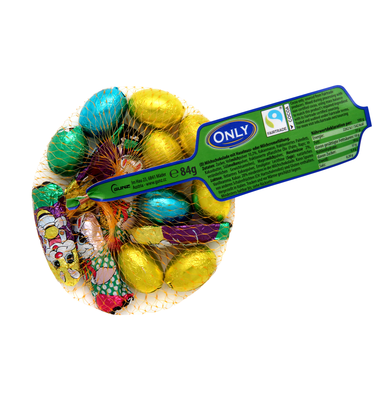 Fröhliche Ostern mit zartschmelzender Schokolade von Only! Das Netz enthält kleine Schokoladenhasen und Schoko-Eier mit einer verführerischen Haselnuss- und Milchcremefüllung. Perfekt zum Naschen, Verschenken oder für die Osternestsuche.