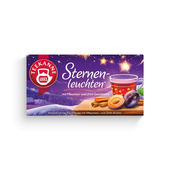Winterliche Momente voller Genuss. Teekanne Sternenleuchten schenkt Ihnen zur kalten Jahreszeit eine verwöhnende Auszeit. Genießen Sie den wärmenden Früchtetee, der mit dem fruchtigen Aroma saftiger Pflaumen und einer würzigen Prise Zimt verführt. Freuen Sie sich auf magische Winterstunden mit dieser besonderen Köstlichkeit.